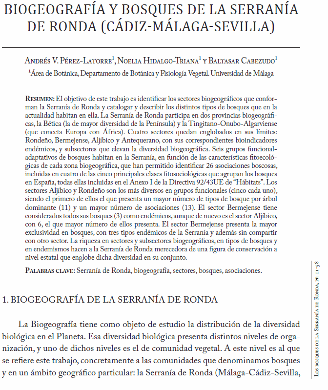 In this book I contribute three chapters, of which I attach the cover of the first, which opens the book, together with Noelia Hidalgo and Baltasar Cabezudo, on "Biogeography and Forests of the Serranía de Ronda", where the existing types of forests are cataloged, with its floristic, ecological, functional characteristics and other environmental considerations.
